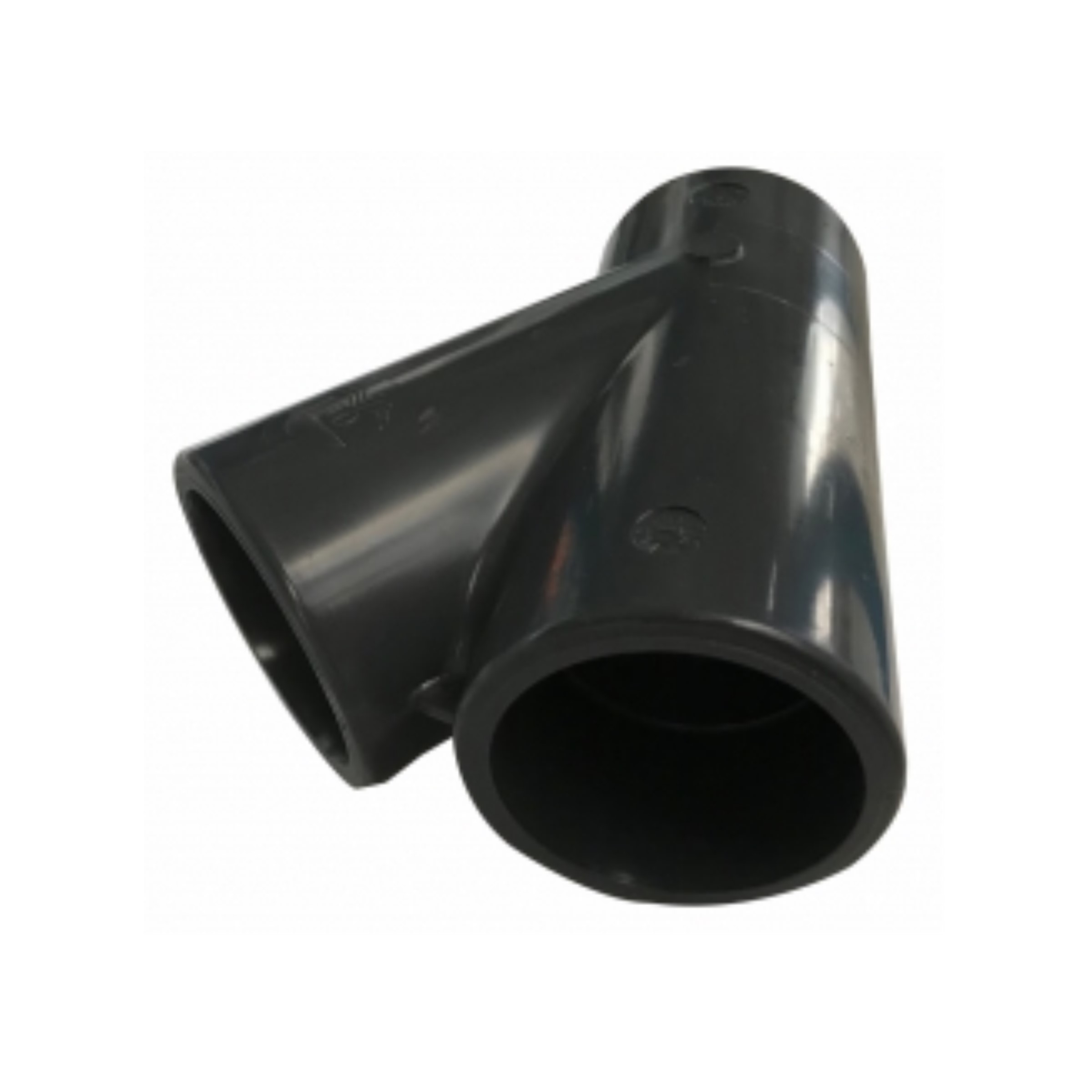 Raccordo Y1SK a T 45° in PVC di colore nero. Serie ad incollaggio per tubi diametro 63 mm. Pressione massima di esercizio 16 bar.
